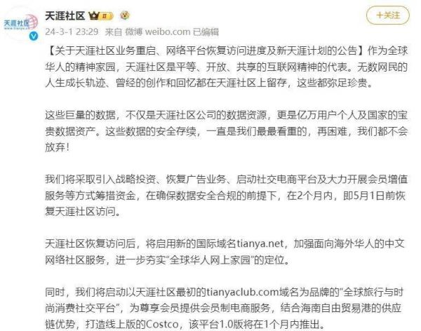 3月1日,天涯社区官方微博发布公告,称将采取引入战略投资、恢复广告业务、启动社交电商平台及大力开展会员增值服务等方式筹措资金,在确保数据安全合规的前提下,在2个月内,即5月1日前恢复天涯社区访问。3月2日,天涯社区创始人邢明在采访中表示,重启的第一目标是先恢复访问。