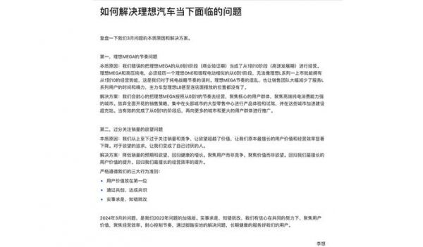 3月21日,李想公开发布了一封全员信,复盘了理想汽车3月以来出现的各种问题,并针对理想MEGA汽车的上市节奏以及过分关注销量的欲望问题,提出了解决方案。