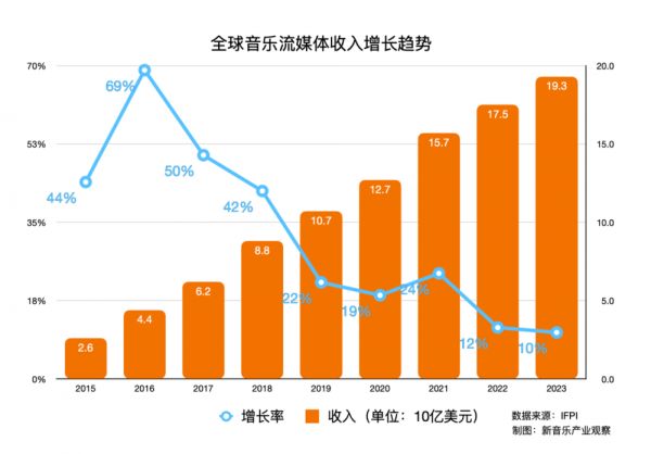 流媒体业务仍然是行业增长的主要推动力,2023年,全球音乐流媒体收入达到193亿美元,增长了10.4%,占总收入的67.3%,订阅流媒体收入增长了11.2%,占全球市场的48.9%。