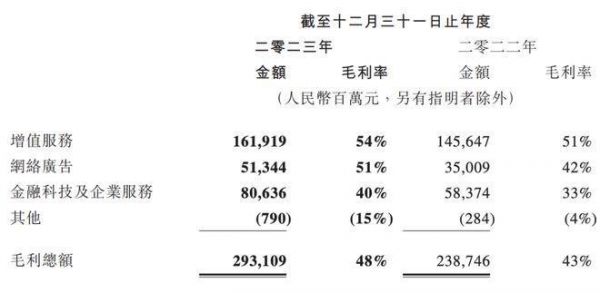 先来关注代表主业经营情况的核心经营利润(不包含其他收益净额的补贴、退税等)。2023 年 Q4,腾讯的核心经营利润为 394 亿,同比增长 39%。增长的势头延续到了 2023 年全年,腾讯的核心经营利润达到 1554 亿,同比增长 51%,可见,腾讯的经营杠杆撬动的利润依然惊人。这不只是 " 降本 " 换来的,还要归功于整体业务的增长,尤其是腾讯对不同毛利业务收入结构的调整。