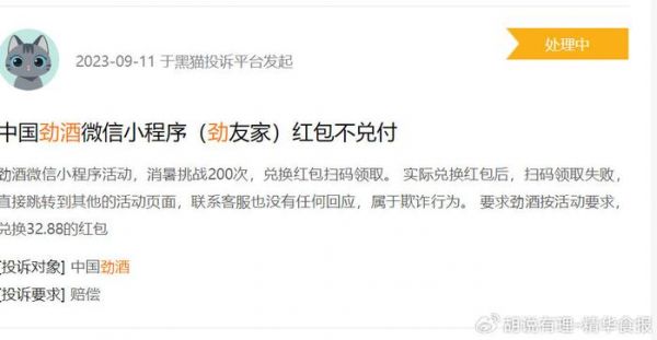 9月11日,又有消费者投诉,“劲酒微信小程序活动,消暑挑战200次,兑换红包扫码领取。 实际兑换红包后,扫码领取失败,直接跳转到其他的活动页面,联系客服也没有任何回应,属于欺诈行为。 要求劲酒按活动要求,兑换32.88的红包”。