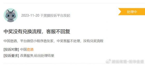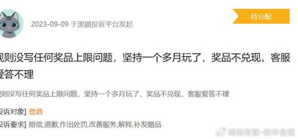 在黑猫平台上,2023年9月9日,有消费者投诉劲酒“规则没写任何奖品上限问题,坚持一个多月玩了,奖品不兑现,客服爱答不理”。