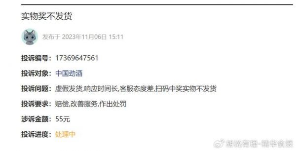 11月6日,有消费者投诉劲酒“虚假发货,响应时间长,客服态度差,扫码中奖实物不发货”。