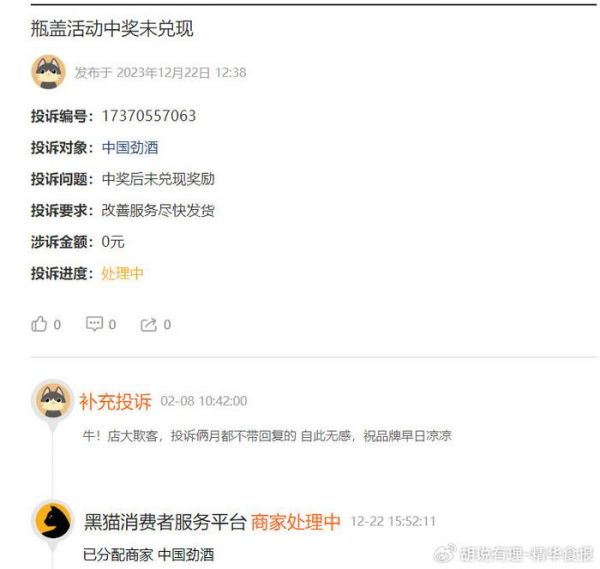 更离谱的是,12月22日,有消费者投诉,自己“于2023年9月3日19时,劲酒开盖扫码活动中得一瓶520ml中国劲酒1瓶,按照要求在公众号登记留取地址电话等信息后,至今未收到相应奖品,期间于10月27日、11月4日两次意见反馈均回复:请耐心等待客服回复 问题至今未解决同时未有任何客服或相关服务反馈。 以上违反承诺及违约行为,请品牌方给予说明及按照约定履行相应义务。”
