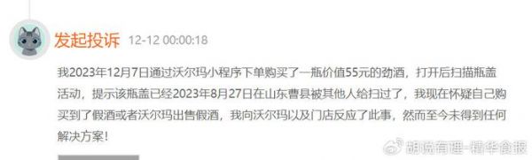 有消费者投诉,自己于2023年12月7日通过沃尔玛小程序下单购买了一瓶价值55元的劲酒,打开后扫描瓶盖活动,提示该瓶盖已经2023年8月27日在山东曹县被其他人给扫过了。该消费者表示,“怀疑自己购买到了假酒或者沃尔玛出售假酒,我向沃尔玛以及门店反应了此事,然而至今未得到任何解决方案!”