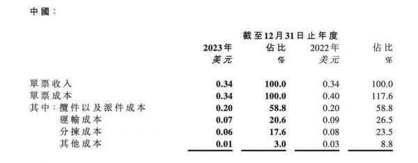 2023年,极兔在东南亚的单票收入有所下降,2023年为0.81美元,2022年则为0.95美元。虽然2023年的单票成本也较2022年降低(2023年为0.67美元,2022年为0.76美元),但大概计算下来2023年的单票毛利为0.14美元,比2022年的单票毛利0.19美元要低一些。