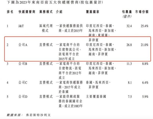 财报中一组东南亚快递公司的份额排名可一窥电商平台自营物流的竞争理。下图中排名第二的公司2023年市场份额也已超过20%。