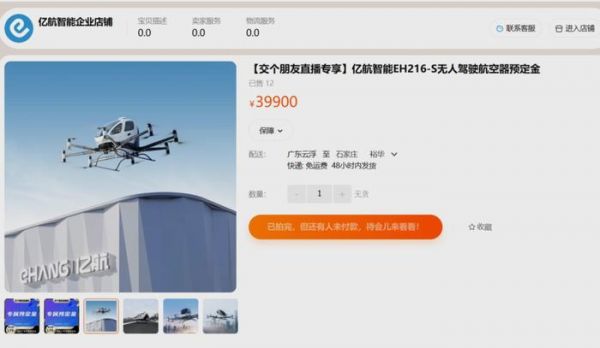 亿航智能相关负责人确认,他们在淘宝平台投放了EH216-S无人驾驶载人航空器的的链接。对于销量数据为0的情况,他们表示公司目前主要订单以及预订单都来自toB和toG业务,上架淘宝平台是为了打开一个新的销售渠道。如果有客户在平台下单,那么会有销售人员进行对接。