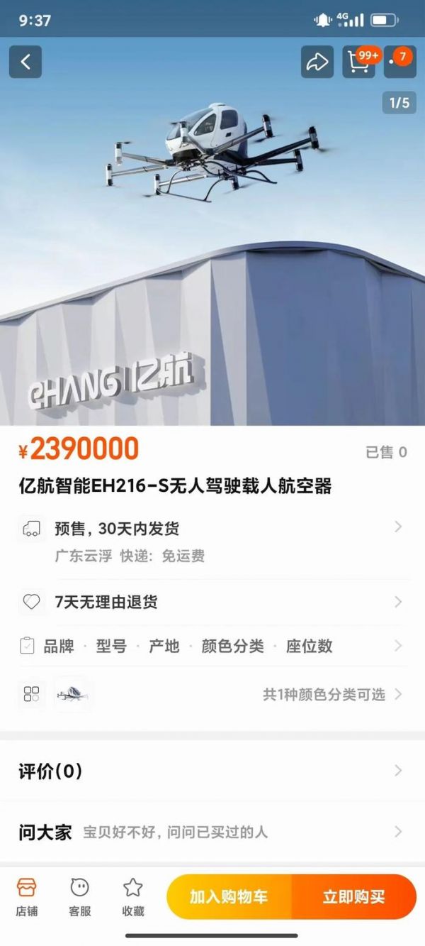 飞行汽车公司亿航智能在淘宝建立了「亿航智能企业店铺」,并上架了无人驾驶载人航空器EH216-S,售价2390000元。「最常用的软件」遇上「最遥不可及的汽车」的结果可想而知,这款无人驾驶的飞行汽车直至现在销量仍为0。店铺内还有一款标价「7个9」的VT-30长行距无人驾驶电动垂直起降航空器。