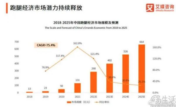 据艾媒咨询发布的《2022年中国跑腿经济市场洞察报告》显示,2021年中国跑腿经济市场规模达131亿元,预计2025年或将达到664亿元,2018-2025年的年复合增长率为75.4%,潜力可谓是巨大。
