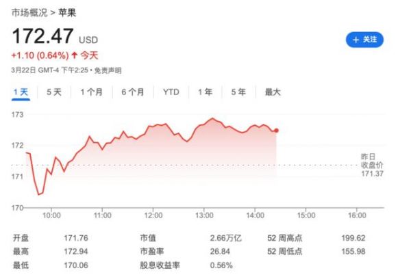 苹果股价周五盘中上涨0.64%,报172.47美元。今年迄今,苹果股价已经下跌10%左右。