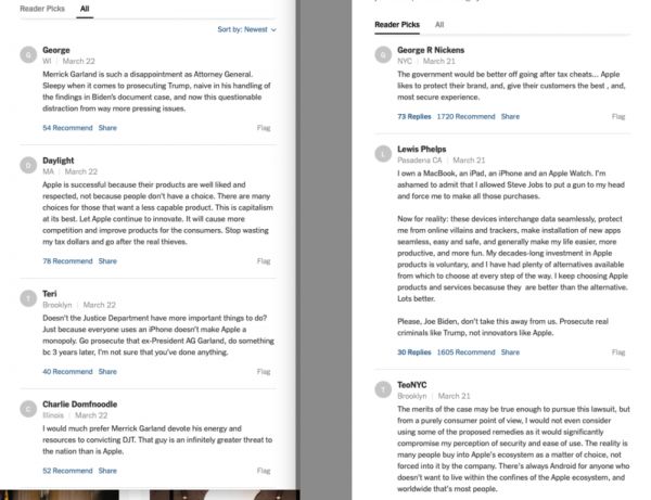 有趣的是,美国主流媒体关于诉讼报道的评论区,绝大多数读者留言也在质疑:司法部应该去寻找更有意义的巨头起诉,苹果完全有权决定自己的产品。看起来,相对于起诉谷歌和Meta等互联网巨头,美国民众并不认可苹果限制自己的操作平台是垄断行为。