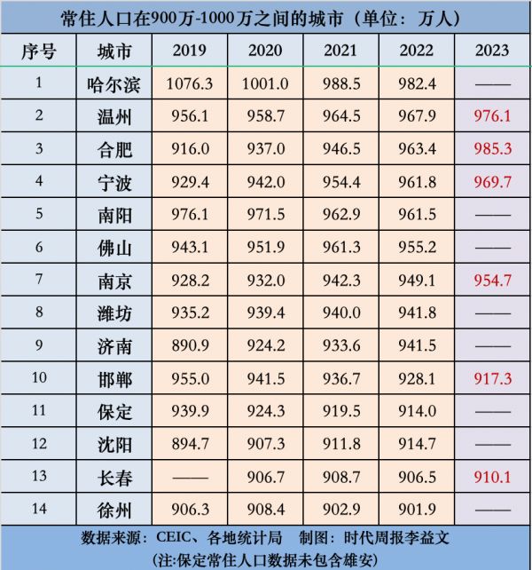 尽管准千万城市中,目前只有邯郸公布了常住人口负增长的情况,但从趋势来看,南阳、保定、徐州、哈尔滨的常住人口已经连续多年下跌。根据CEIC以及官方统计数据,哈尔滨常住人口数从2019年的1076.3万,下跌至2022年的982.4万,4年间减少约94万人,跌出千万人口俱乐部。
