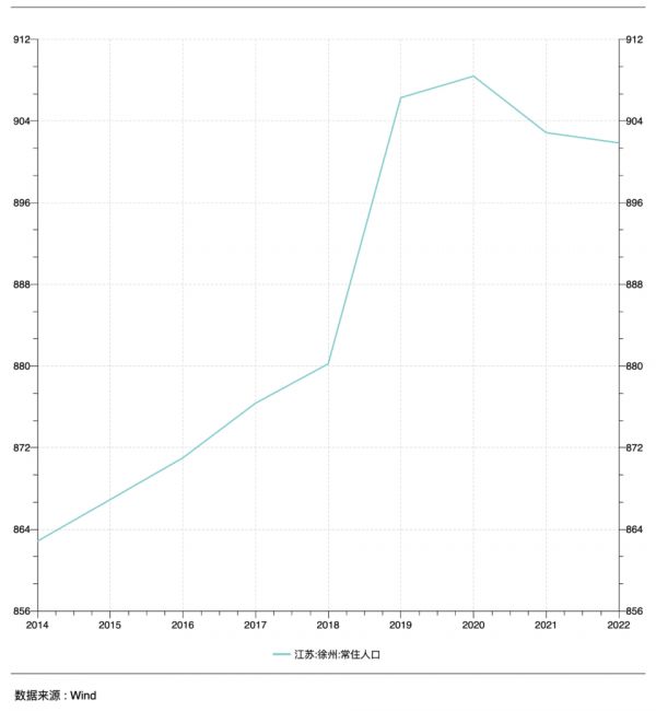 而此前常住人口增势相对迅猛的徐州,在2021年和2022年也接连下跌,2022年末的常住人口为901.9万,较2020年的高点减少了6.5万人,距离重回800万区间,仅一步之遥。