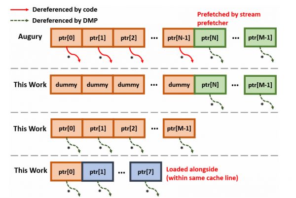 2022年,GoFetch研究团队在M1和iPhone A14仿生芯片中,发现了一个以前未知的“指针追逐 DMP”。这项研究来自不同的学者群体,引发了名为Augury的攻击,这是一种识别并利用泄漏指针的内存侧通道的攻击。最终,当使用常量时间编程后,Augury无法将数据信息和数据地址混合在一起。