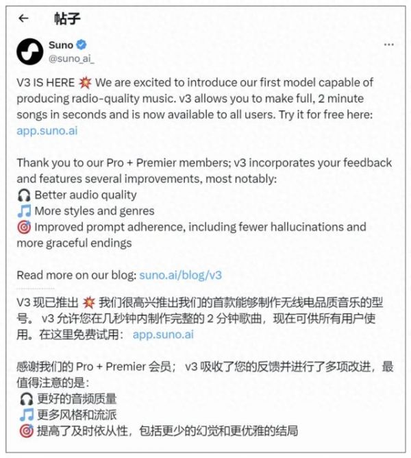 据IT之家,AI初创公司Suno近日发布了首款能够生成“广播级”歌曲的工具,能够在数秒之内创作出2分钟的完整歌曲,所有用户均可免费访问。该平台最令人惊奇之处,就是在用户给出指定歌词之后能够生成不同曲风、流派的歌曲,甚至可以指定AI歌手的音色。任何人,哪怕五音不全,毫无音乐创作功底,只需一个简单的文本提示,就可以秒出一首最长达2分钟的歌曲。