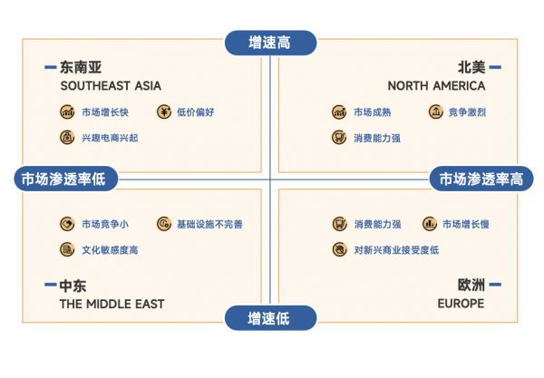 从整体来看,北美市场最成熟、最大,竞争也最激烈;欧洲市场虽然消费力强,物流和支付配套相对成熟,但对商品和交易的规范限制更多,对新兴电商形式的接受程度也更低;东南亚六国(新加坡、菲律宾、印尼、泰国、马来西亚和越南)正在从三年前的“蓝海”迅速变为“红海”,货架电商降速的同时,内容电商成为新的增长引擎;中东三国(沙特、阿联酋和土耳其)市场正在迅速扩大,但短时间内仍无法解决基础设施难题。