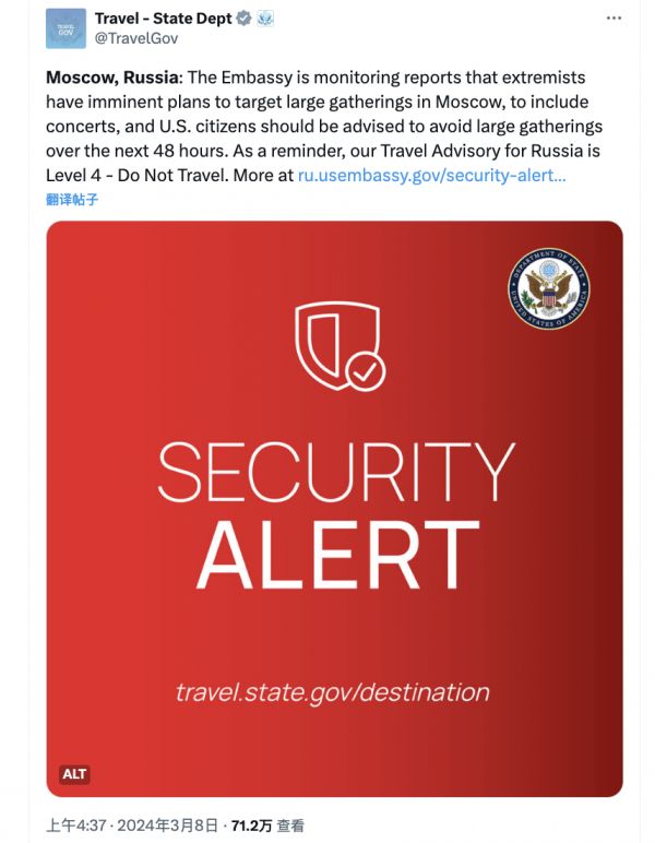 在公开渠道上,当地时间3月8日,美国驻莫斯科大使馆就曾发表声明,表示“正在监测有关极端分子即将针对莫斯科大型集会(包括音乐会)进行袭击的报道,建议美国公民在未来48小时内避免大型集会”。