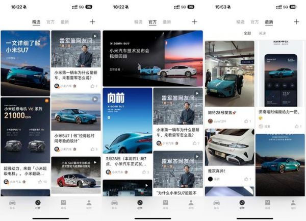 至于“社区”分区中,陆续有注册了App的用户开始分享他们自己的见闻,尤其以今天开放的小米汽车线下展厅探馆内容为主。除此之外内容输出的主力是小米官方账号,发布了数十个图文或视频内容,都是以车型介绍、雷军的讲话为主。