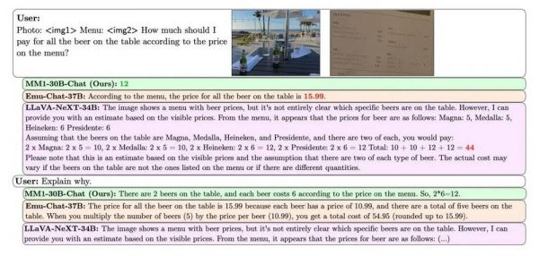 相关论文举例说明了 MM1 在识图、推理方面的能力:MM1 看到一张阳光斑驳的餐厅桌子,上面有着几个啤酒瓶和菜单的图片,被问及“人们要为桌上的啤酒支付多少费用”时,MM1 读出了菜单的价格并计算出啤酒的价格。