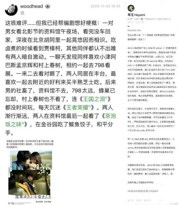 这样的案例数不胜数,本土化之后呈现的不伦不类最是观众集中吐槽的地方。比如《深夜食堂》强行复刻居酒屋,《外公芳龄38》复制韩版表演模式。这也是《花束般的恋爱》宣布翻拍后,引起网友一片质疑与嘘声的原因,原作故事里的日式文艺更加抽象细腻,网友们并不信任片方能完成好,于是,自发进行二创,写出各地版本的文青恋爱故事,提前提供本土化思路。