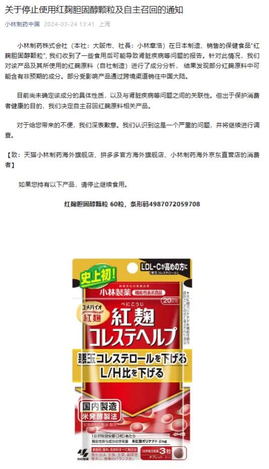 3月24日,小林制药中国官方再次发布《关于停止使用红麹胆固醇颗粒及自主召回的通知》。通知称,在日本制造并销售的该保健食品收到了一些食用后可能导致肾脏疾病等问题的报告。“针对此情况,我们对该产品及其所使用的红麹原料(自社制造)进行了成分分析, 结果发现部分红麹原料中可能含有非预期的成分。部分受影响产品通过跨境渠道销往中国内地。”