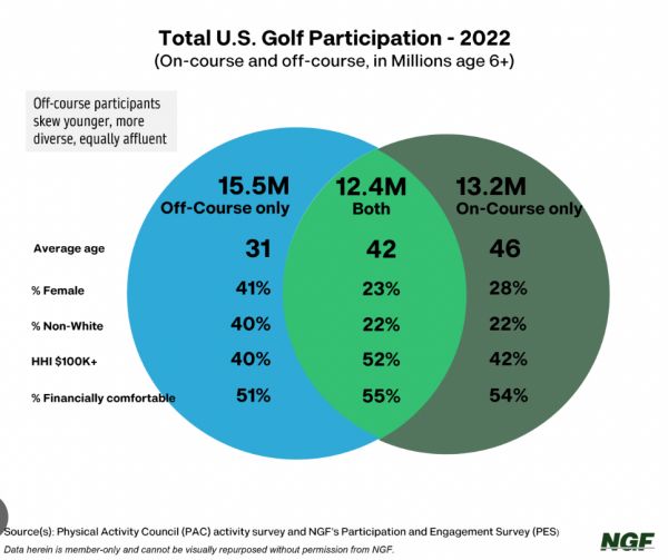 尤其是在美国,“高尔夫球是一项大众化运动”的认识已经越来越多。根据美国高尔夫基金会统计,2022年美国高尔夫球人口已经达到4110万人,其中场外参与人数高达1550万,首次超过现场果岭1320万的数量。