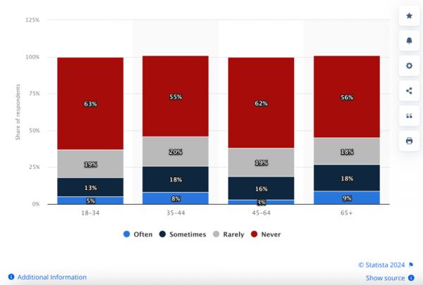 根据Statista的数据,2022年美国国内18~34岁受访者中,超过80%的人表示他们很少或从不看职业高尔夫球赛,而65岁以上受访者中经常观看这一赛事的人占了9%。
