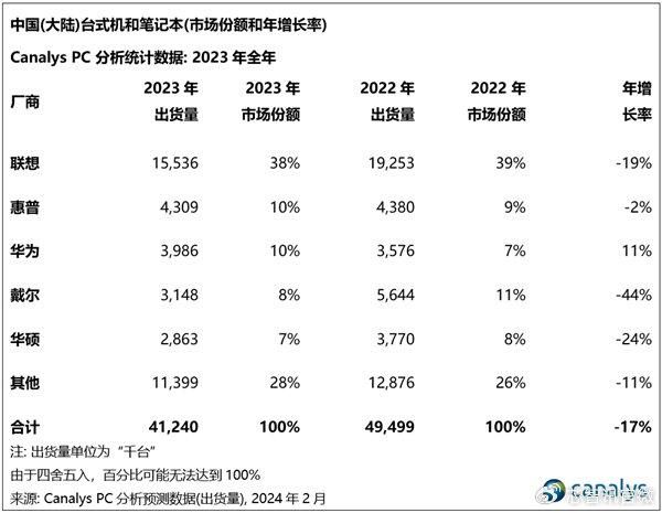 2023中国PC市场:戴尔销量暴跌44%,华为逆势增长11%!