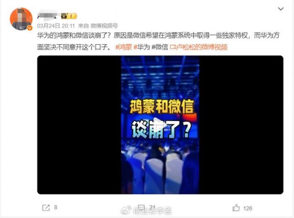 但的确也有言论在说:华为的鸿蒙和微信谈崩了?原因是微信希望在鸿蒙系统中获得一些独家授权,而华为坚决不同意开这个口子!有人说微信想要最高的权限,跟手机打电话的这个功能是平级的
