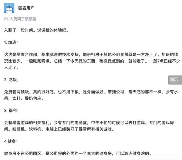 在知乎的一条“网之易—网易暴雪部上海的工作待遇如何?”的问题下,也有数名员工表示入职体验不错。尤其是加班,相对于其他公司来说显然是一方净土:“一般7点就已经有不少人走了。”