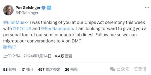 3月25日消息,英特尔首席执行官帕特·基辛格近日通过社交平台“X”公开邀请特斯拉首席执行官埃隆·马斯克参观英特尔公司的半导体生产线。