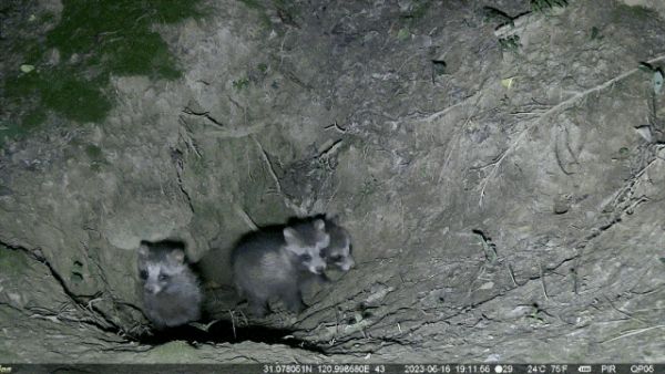 刚刚出“家门”挤在洞口的小貉们。受访者提供,由红外相机拍摄。