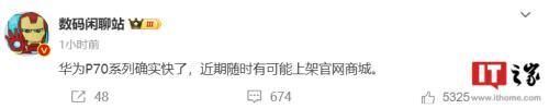 数码博主爆料称,“华为 P70 系列确实快了,近期随时有可能上架官网商城。”