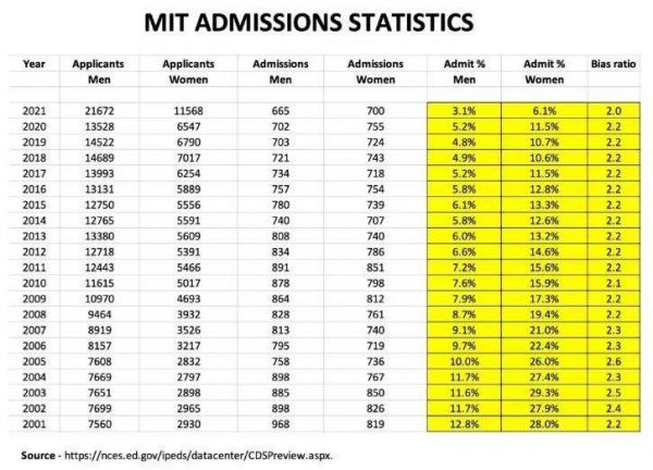 其实,录取率的性别差异并非独见于MIT一校,而是美国高校圈的普遍现象。