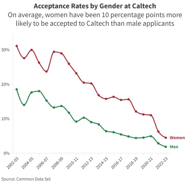 《华盛顿邮报》在2014年的一项分析表明,四所以科学和工程见长的院校——麻省理工学院、加州理工学院(California Institute of Technology)、卡内基梅隆大学(Carnegie Mellon)和哈维穆德学院(Harvey Mudd),校园中的男性占比显著高于女姓。也正是在这些院校,女性录取率大幅高于男性。在加州理工学院,自2003~2004学年以来,男女申请者的录取率平均相差10个百分点。2022~2023学年的女生录取率是男生的两倍以上。