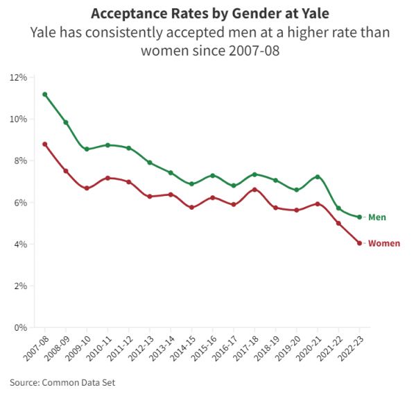 耶鲁大学(Yale)同样存在类似偏向,自2008~2009学年以来,耶鲁大学的男生录取率始终高于女生。2022~2023学年,女性和男性在申请者中分别占比58%和42%,这一差距在新生中收窄,分别占比51%和49%。