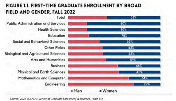仍以2022年秋季入学的研究生为例,虽然女性总体占比达58%,但在不同专业领域的比例分布十分不均,各专业性别偏向明显。女性在公共行政服务(79.6%)、健康科学(79.5%)领域占据绝对优势,却在工程(29.0%)、数学与计算机(34.2%)、物理与地球科学(45.2%)等领域举步维艰。此外,全体新生中男性的全日制就读比例(74.3%)也高于女性(68.7%)。