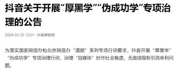 日前,抖音官方发布《关于开展“厚黑学”“伪成功学”专项治理的公告》,表示将专项治理“自媒体”炒作社会焦虑,无底线吸粉引流牟利问题。