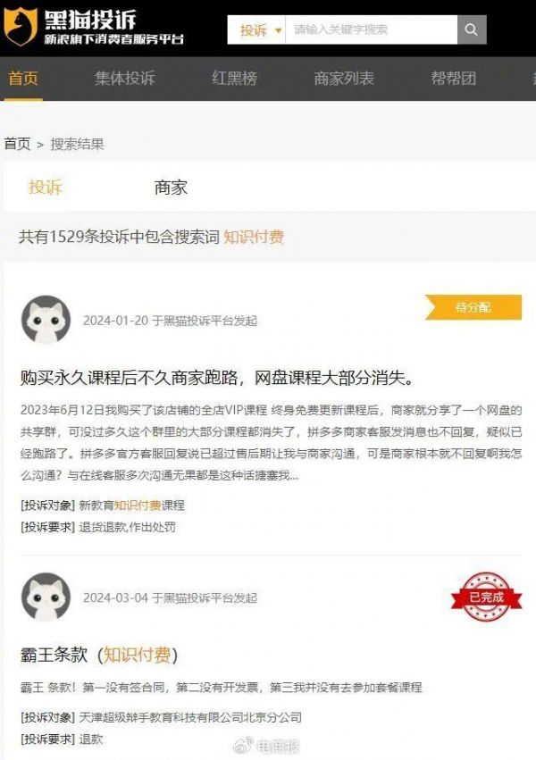 近两三年来,知识付费这一概念频频亮相于公众视野,引起了广泛关注与讨论。 然而,在这些讨论中,负面声音似乎占据了主导。许多人对知识付费持怀疑态度,认为其存在着种种问题。 在黑猫投诉网站上,关于“知识付费”的投诉累计达到了1529条,主要问题集中在虚假宣传、不合理收费、内容质量参差不齐以及价格虚高等方面。