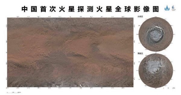 在行星探测方面,我国发布首次火星探测火星全球影像图(见图1),包括按照制图标准分别制作的火星东西半球正射投影图、鲁宾逊投影图和墨卡托投影加方位投影图,空间分辨率为76m,将为开展火星探测工程和火星科学研究提供质量更好的基础底图。