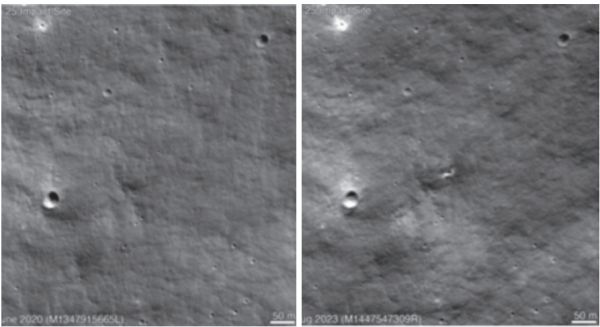 2023年8月11日,俄罗斯“月球”25(Luna-25)探测器从东方航天发射场发射升空,8月19日,Luna-25失联,进入了非预定轨道并坠毁在月球表面。9月1日,NASA发布月球新“陨石坑”图像,推测这些“陨石坑”可能由Luna-25探测器造成(见图6)。