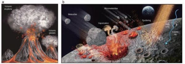 图8,月球表面各类玻璃物质的固、液、气多种路径起源示意图