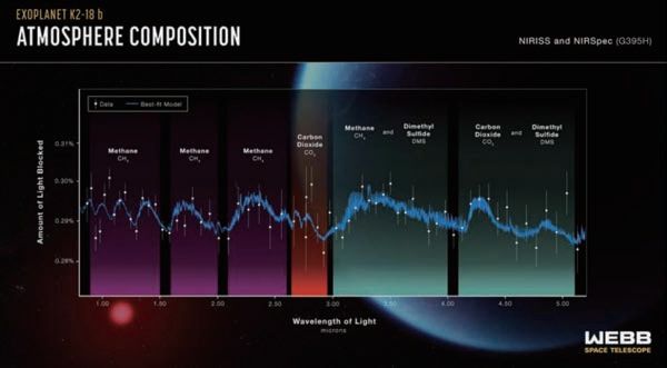 图9,利用“詹姆斯·韦伯”太空望远镜近红外成像仪和近红外光谱仪获得的k2-18b的光谱信息