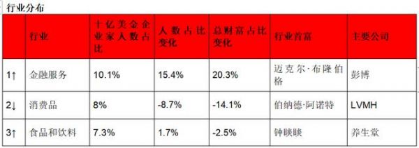 从十亿美元企业家人数来看,金融服务(人数占比10.1%)和消费品(8%)是前两大财富来源。