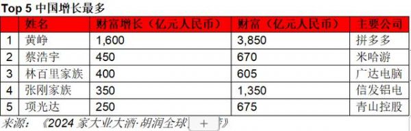 上榜的中国企业家中,拼多多黄峥连续两年成为中国财富增长最多的企业家,去年增长了800亿元人民币,今年又增长了1600亿元,位列全球涨幅前20。