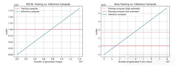 (左图对比DiT的训练与推理计算,右图对比Sora的训练与推理计算。对于Sora部分,我们的数据基于上文估计,因此不是完全可靠。我们还展示了两种训练计算的估计:一种低估计(假设数据集大小的倍增因子为4倍)和一种高估计(假设为10倍)。)