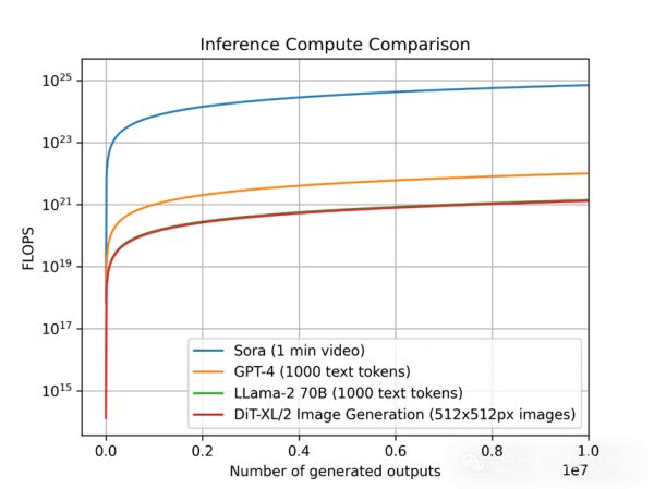 (比较不同模型每单位输出的推理计算量,对于Sora是1分钟视频,对于GPT-4和LLama 2是1000个token的文本,对于DiT是单张512x512像素的图像。我们可以看到,我们对Sora推理的估计比其他模型昂贵,要高出数个数量级。)
