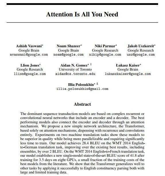 2017 年春天,一篇名为“Attention Is All You Need”的科学论文中,列出了 8 位作者。他们都是 Google 的研究人员,尽管其中一人那时已离开了公司。