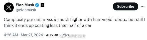 【#马斯克称人形机器人成本不到汽车一半#】斯克在回应一位用户的帖子中表示,人形机器人的成本最终将不到一辆汽车的一半。该用户写道:“人形机器人的重量还不到汽车的十分之一,那么制造坡道能达到汽车的十倍吗?这有什么关系吗?似乎制约因素将是软件能力而不是制造能力。” 马斯克回应称,“人形机器人单位质量的复杂性要高得多,但我仍认为它最终的成本将不到一辆汽车的一半”。在另一条回复中,马斯克告诉一位用户,Optimus最初的售价将在2.5万美元至3万美元之间,并随着时间的推移而降低。(每日经济新闻)